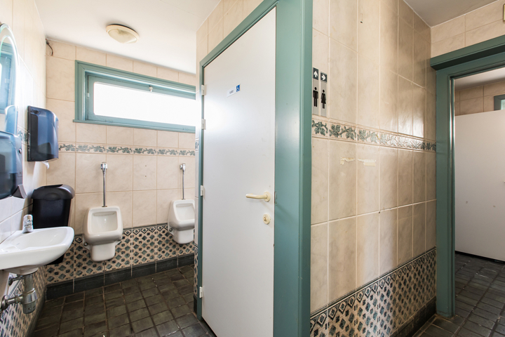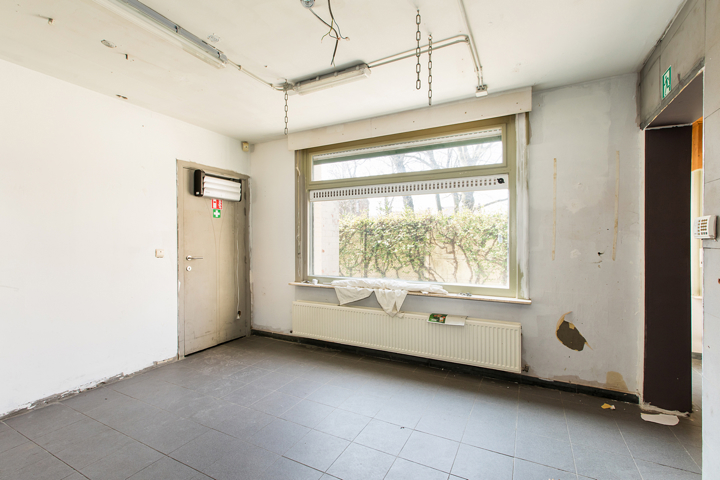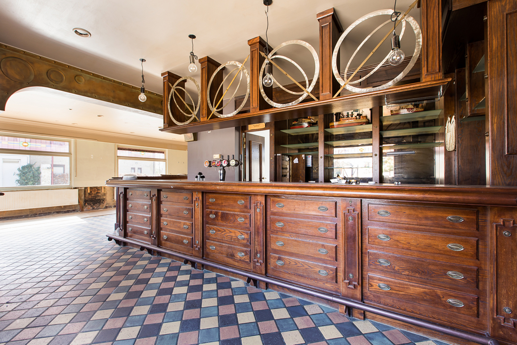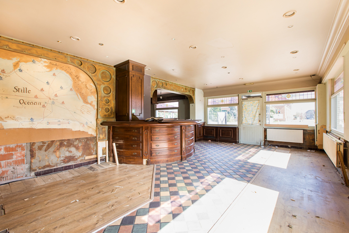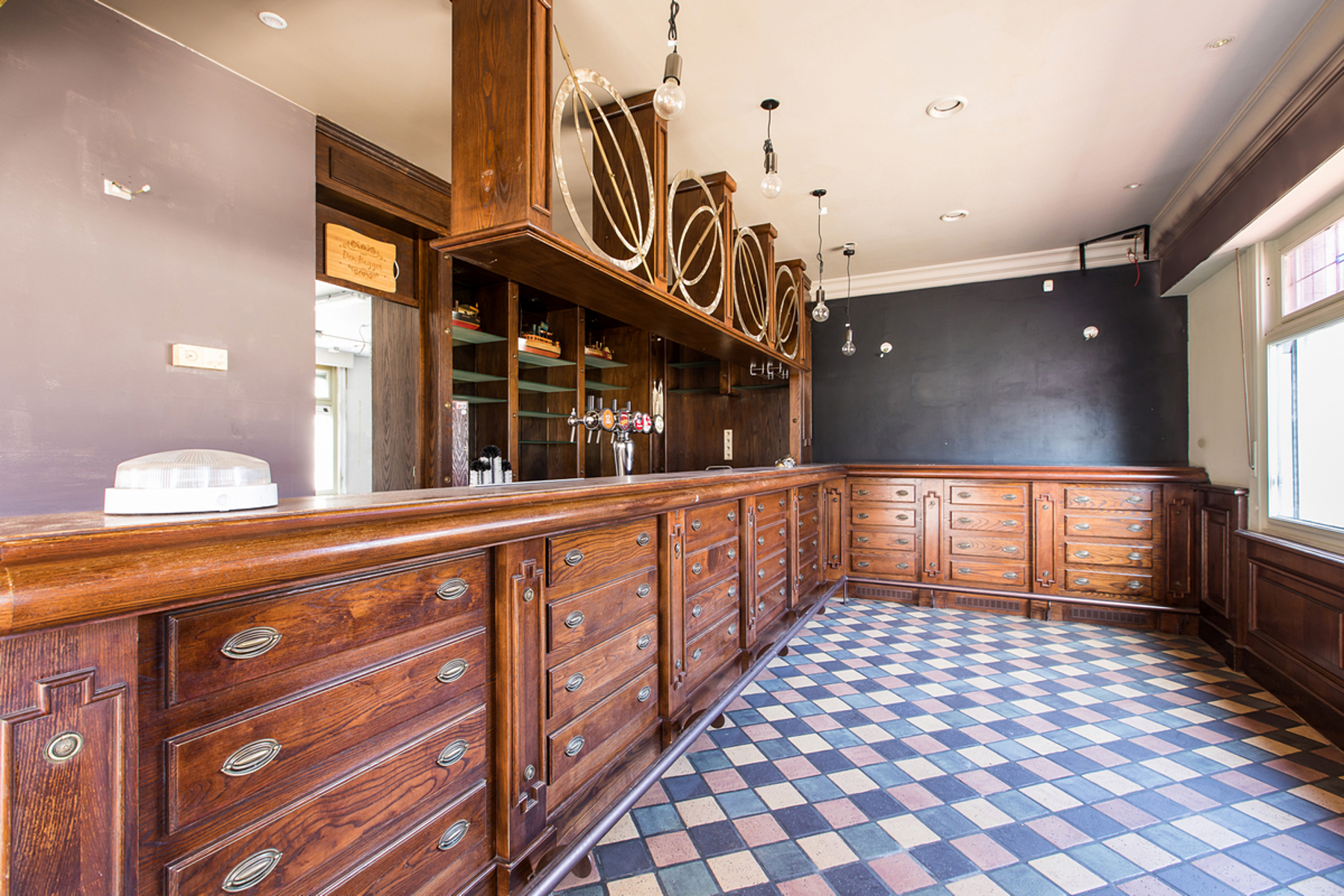 Indeling gelijkvloers: via het grote buitenterras komen we in de gebruiksklare taverne met toog. Links achteraan bevindt zich het sanitaire gedeelte met de nodige voorzieningen in aparte ruimtes voor dames en heren. Van achter de toog komen we in de keuken. Verder rechts, de opslagkamer met de nodige voorzieningen voor wasmachine, droogkast en de inpandige garage. Aan de linkerzijde van de keuken is de trap naar de bruikbare kelder en de ingang naar het woongedeelte.