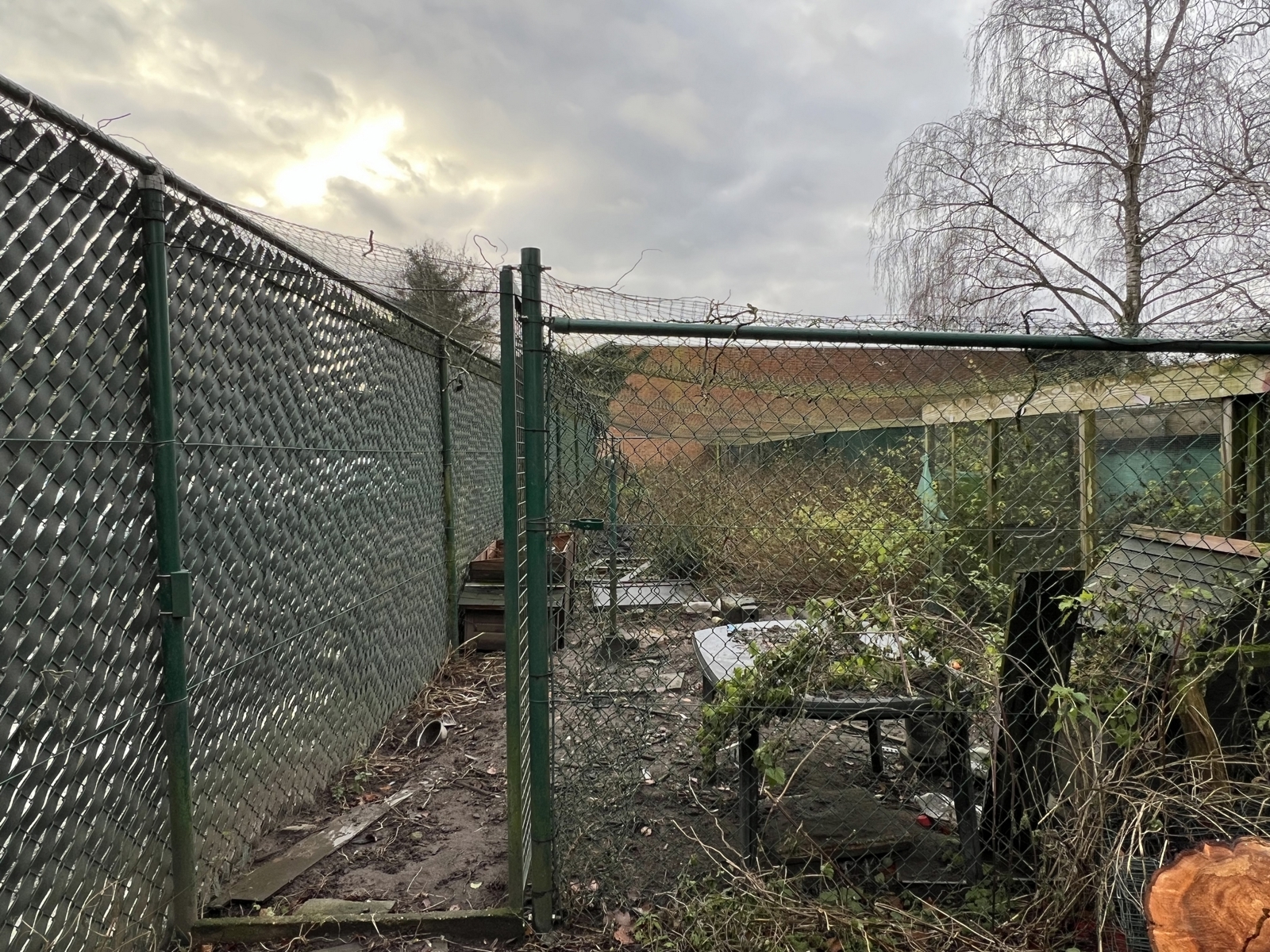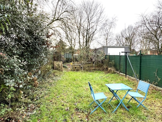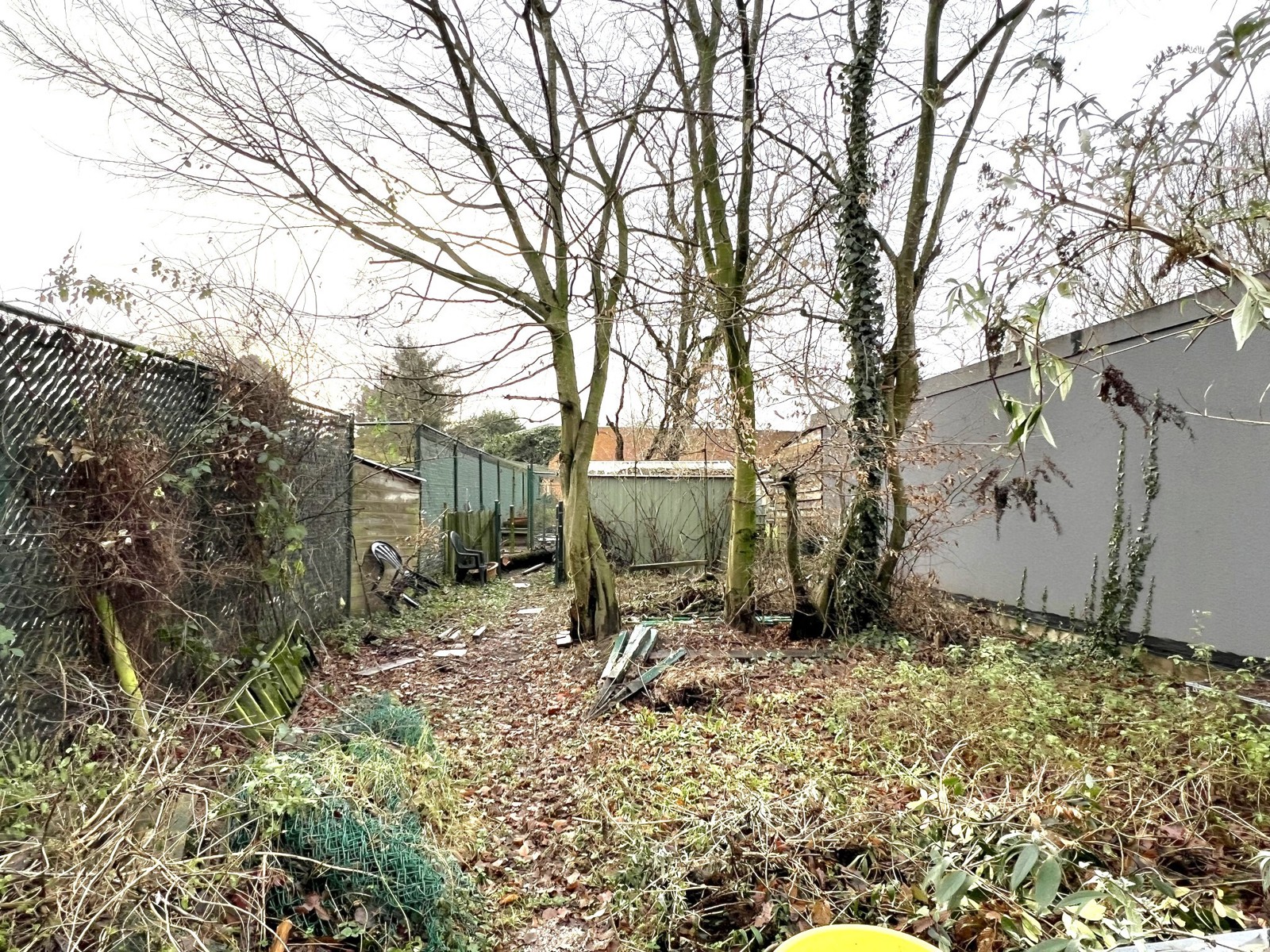 Achteraan beschikt deze woning over een omheinde tuin met twee garages dewelke bereikbaar is via de linkerzijde van de woning.