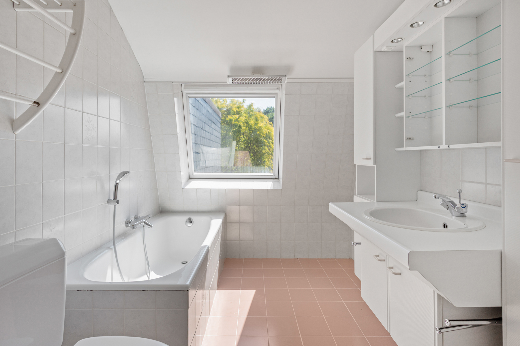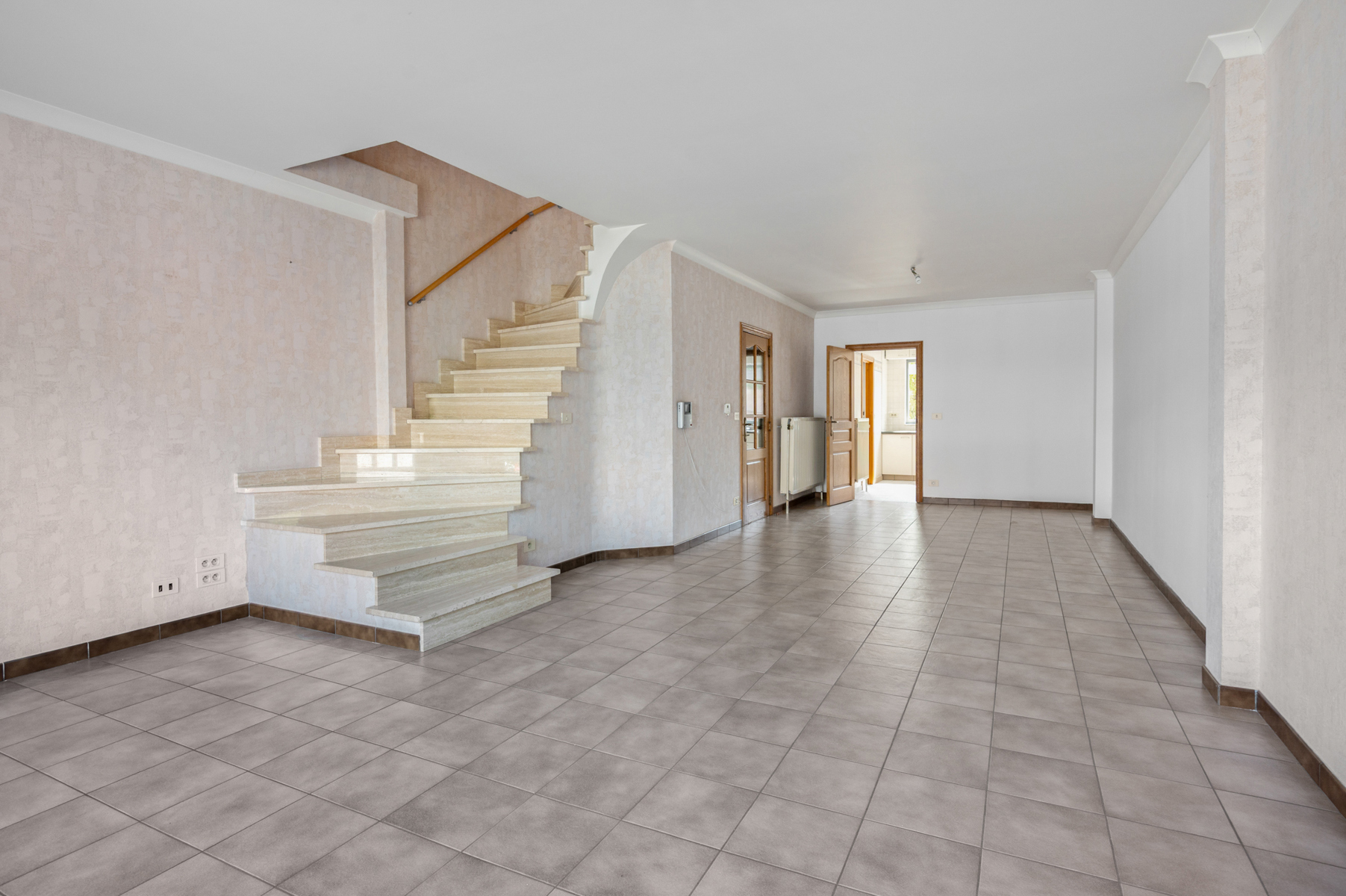 Op de eerste verdieping bevindt zich het ruime duplexappartement. U betreedt het appartement via de inkomhal, waar het gastentoilet zich bevindt. Verderdoor de woonkamer, met de trap naar de bovenverdieping, welke toegang geeft tot de keuken. Deze is voorzien van boven- en onderkasten, kookplaat, dampkap, dubbele spoelbak en oven. Hiernaast de berging met de deur naar het terras. Via de trap naar de bovenverdieping bereiken we de twee slaapkamers, tussenkamer en badkamer met bad, toilet en lavabo met meubel.