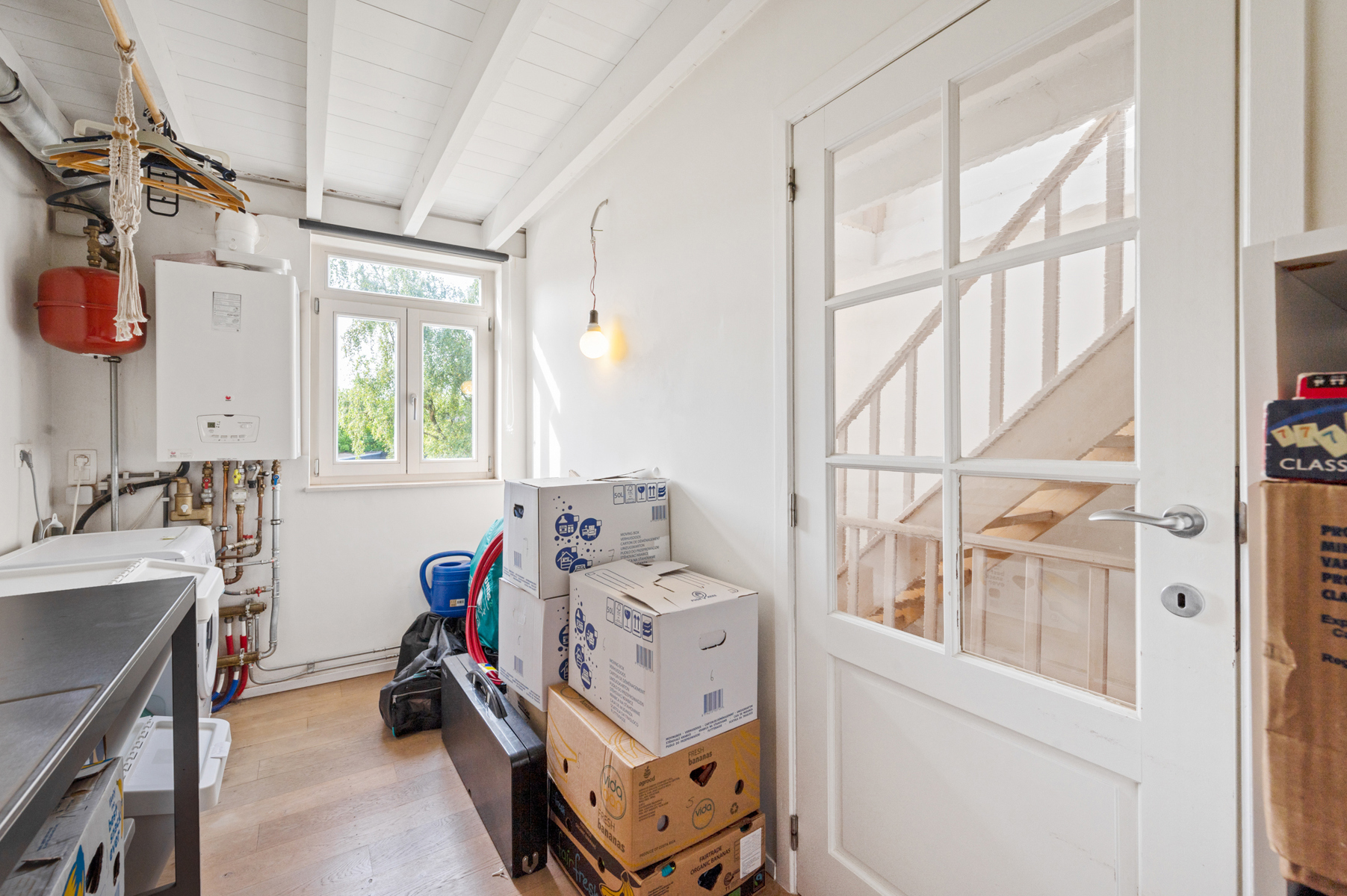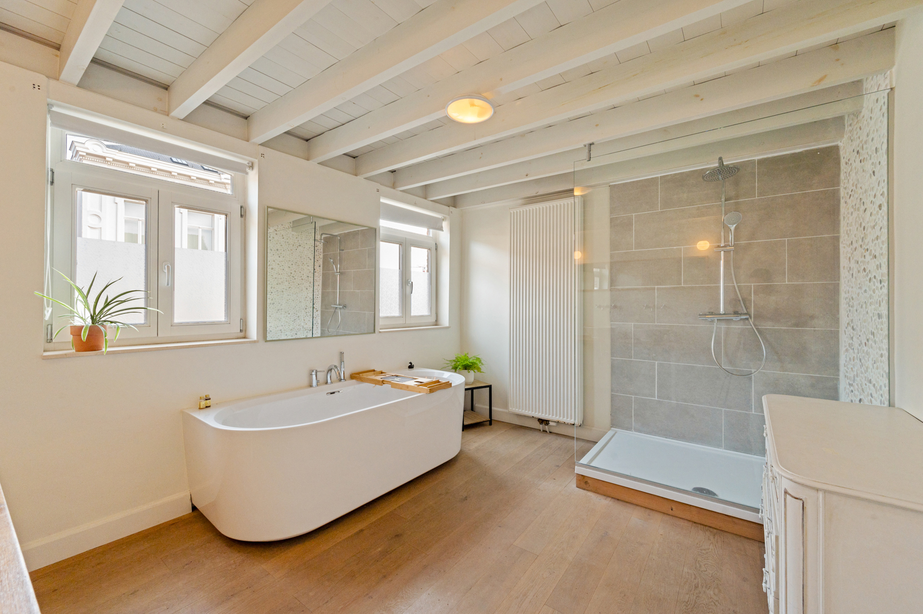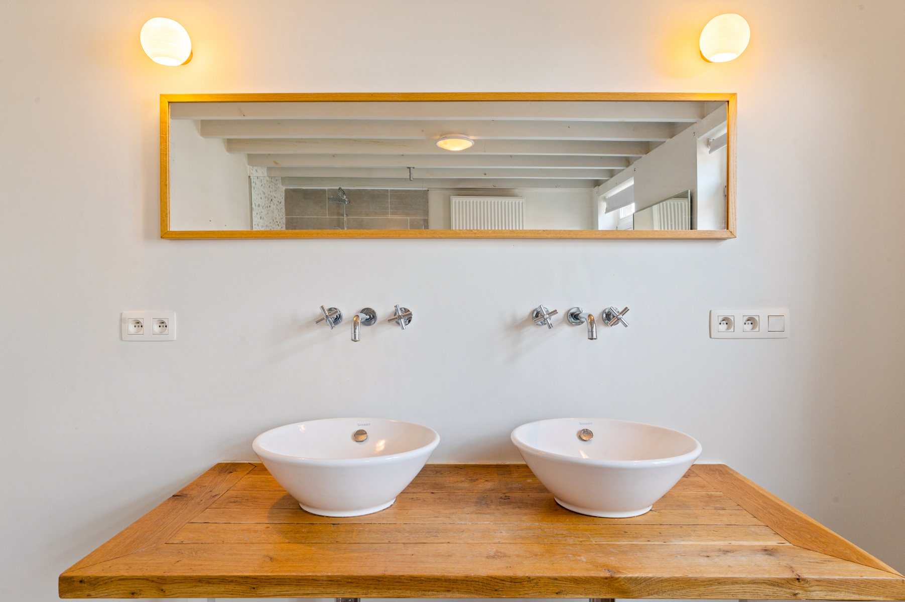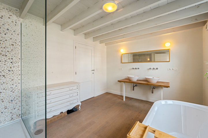 Op de eerste verdieping bevindt zich een moderne badkamer uitgerust met een ligbad en een douche. Daarnaast is er een apart toilet en een praktische berging die dienstdoet als wasplaats.