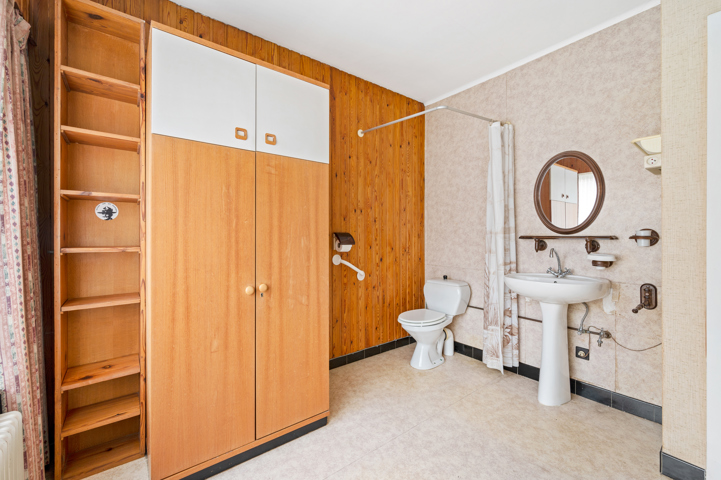 Bij binnenkomst in de ruime inkomhal valt meteen de multifunctionele ruimte aan de achterzijde op, waaronder zich een kleine kelder bevindt. Rechts van de inkomhal leidt een trap naar de bovenverdieping. De eethoek is aangenaam licht en sluit naadloos aan op de woonkamer, terwijl de keuken vlot bereikbaar is vanuit de eethoek. Achteraan bevindt zich de badkamer, uitgerust met een ligbad en een lavabo, en daarnaast is er een aparte toiletruimte voorzien.