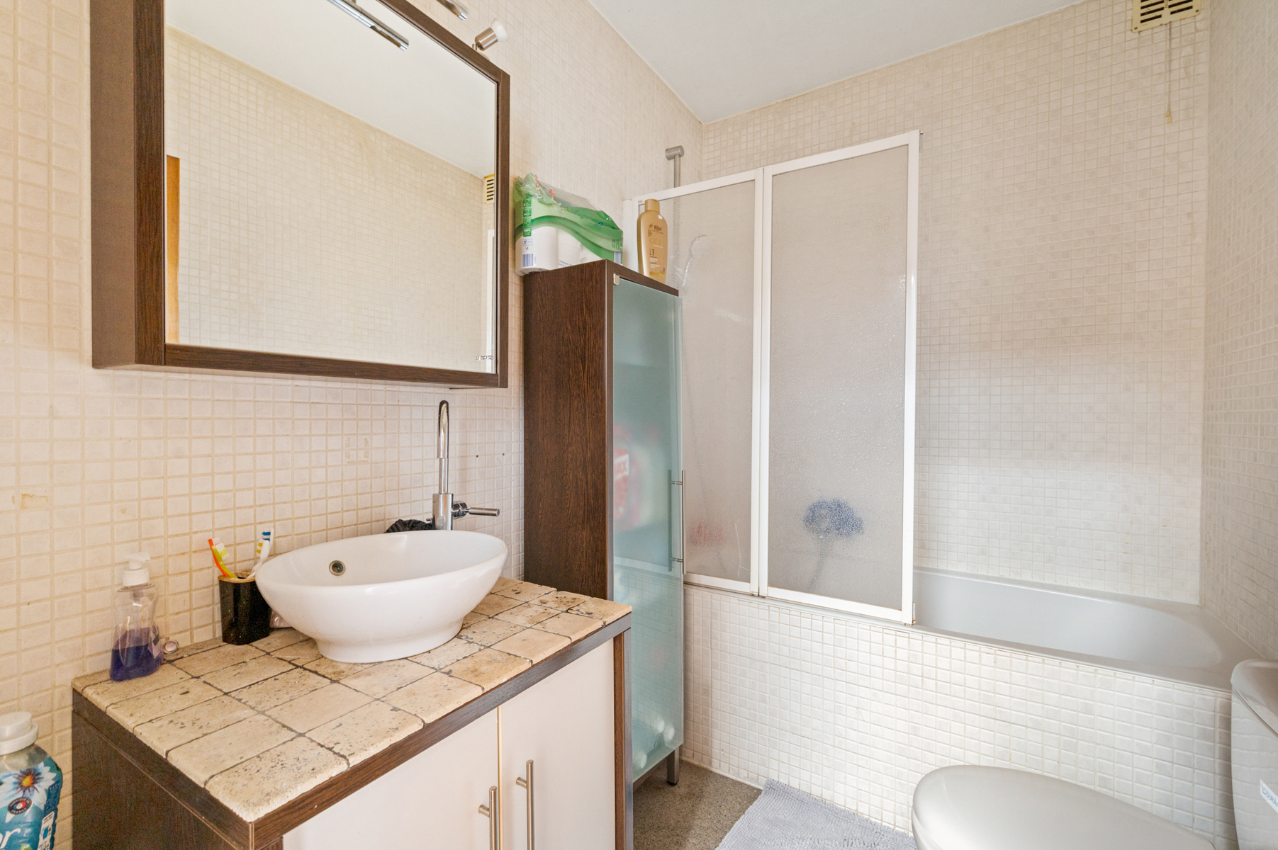 De badkamer beschikt over een lavabo, een combinatie van bad en douche, en een toilet. Aan de rustige achterzijde van het appartement bevinden zich twee volwaardige slaapkamers met zicht op het groen. De master bedroom geeft toegang tot een aangenaam terras, waar u in alle privacy en stilte kan genieten.